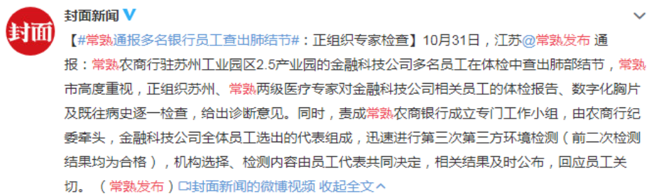 2020年10月31日,常熟農商銀行多名員工在體檢中監測出肺部結節,據北京青年報報道,受害員工的最新數據,相比于網貼披露的96人,至10月29日,肺結節患病員工已達106人(僅統計加入微信病友群的人數),“其實員工患有肺部結節人數遠遠不止106人”,此外還有3名員工“已確認肺癌”。