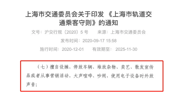 12月1日起,新修訂的《上海市軌道交通乘客守則》將正式實(shí)施。其中新增了針對(duì)手機(jī)等電子設(shè)備聲音外放的禁止條款。